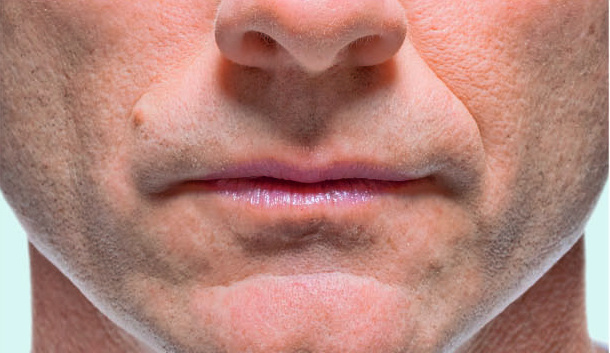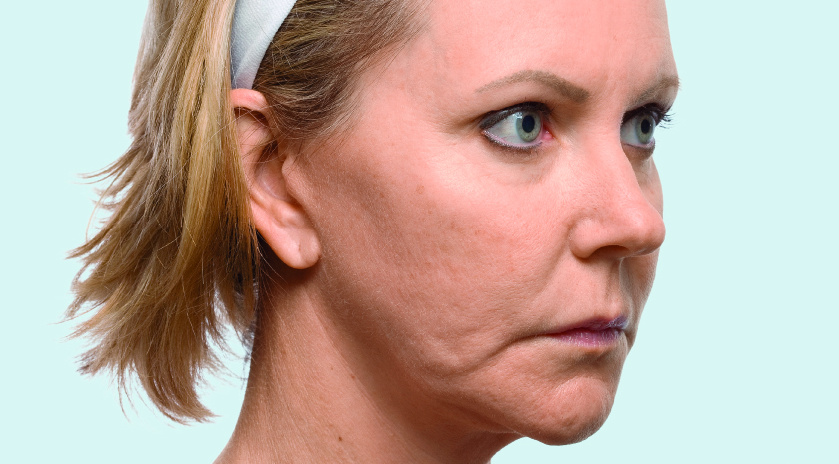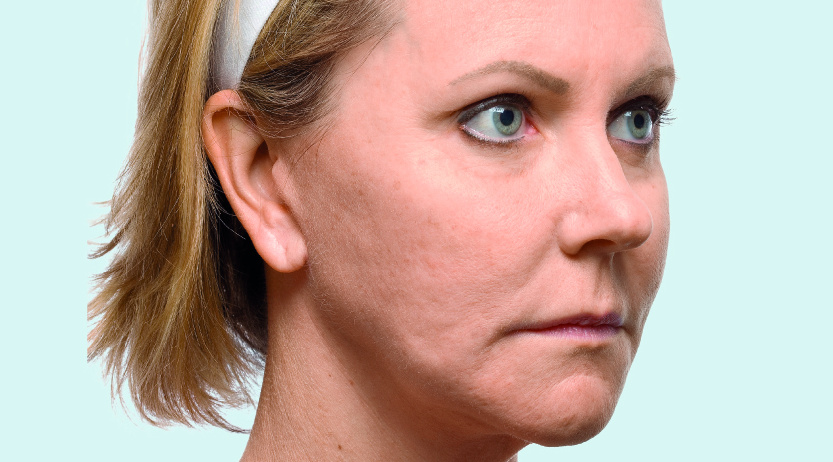 De rimpels verdwijnen helemaal of worden minder. De wenkbrauwen komen zichtbaar omhoog en de blik wordt weer open en vriendelijk.