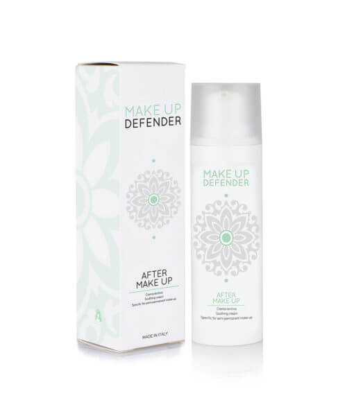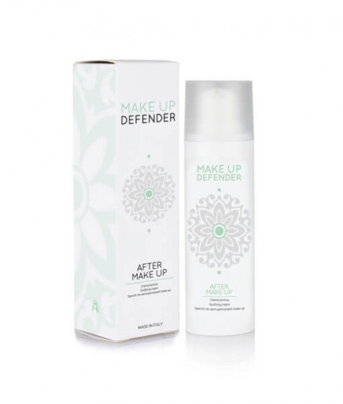 After Make Up van Make Up Defender is een romige emulsie met hyaluronzuur, bisabolol, erythritol, sheaboter, allantoïne, siegesbeckia orientalis extract, rabdosia rubescens extract, rijstolie, avocado-olie en vitamine E. Geschikt voor alle huidtypes, het kalmeert en de hydraterende eigenschappen maken het een effectieve nazorg voor permanente make up.